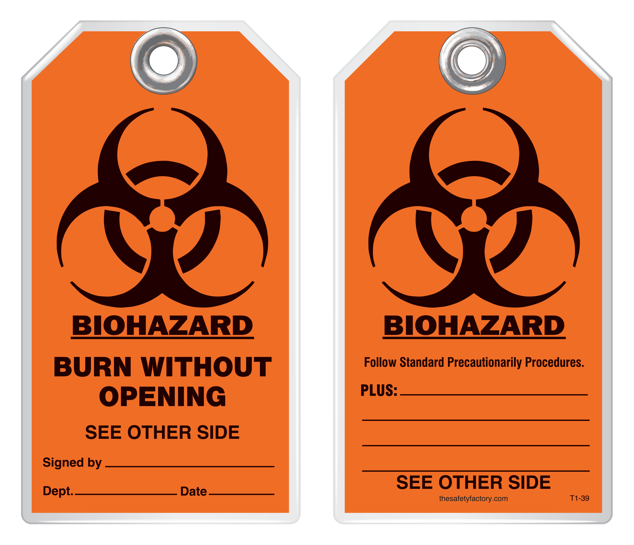 The Safety Factory's Classic Industrial safety tags are uniquely durable and strong and they are the most popular lockout safety tag for thousands of industrial companies around the world! They hold up against moisture, dirt, grease, chemicals and extreme temperatures. Each tag has a 3/8 hole reinforced with a metal grommet and has a pull strength that exceeds the 50 lb pull strength established by OSHA's Lockout/Tagout standard (OSHA 1910.147). Printing is UV protected and encapsulated inside rigid PVC. This rugged material has a durable, hard-matte finish which retains pen, pencil and marker notations and pencil may be erased for multiple use.