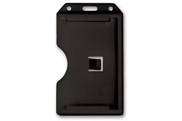 Black Rigid Plastic Vertical 2-Sided Multi-Card Holder., holds 1- 30 mil card on one side and 2- 30 mil cards on the other.
