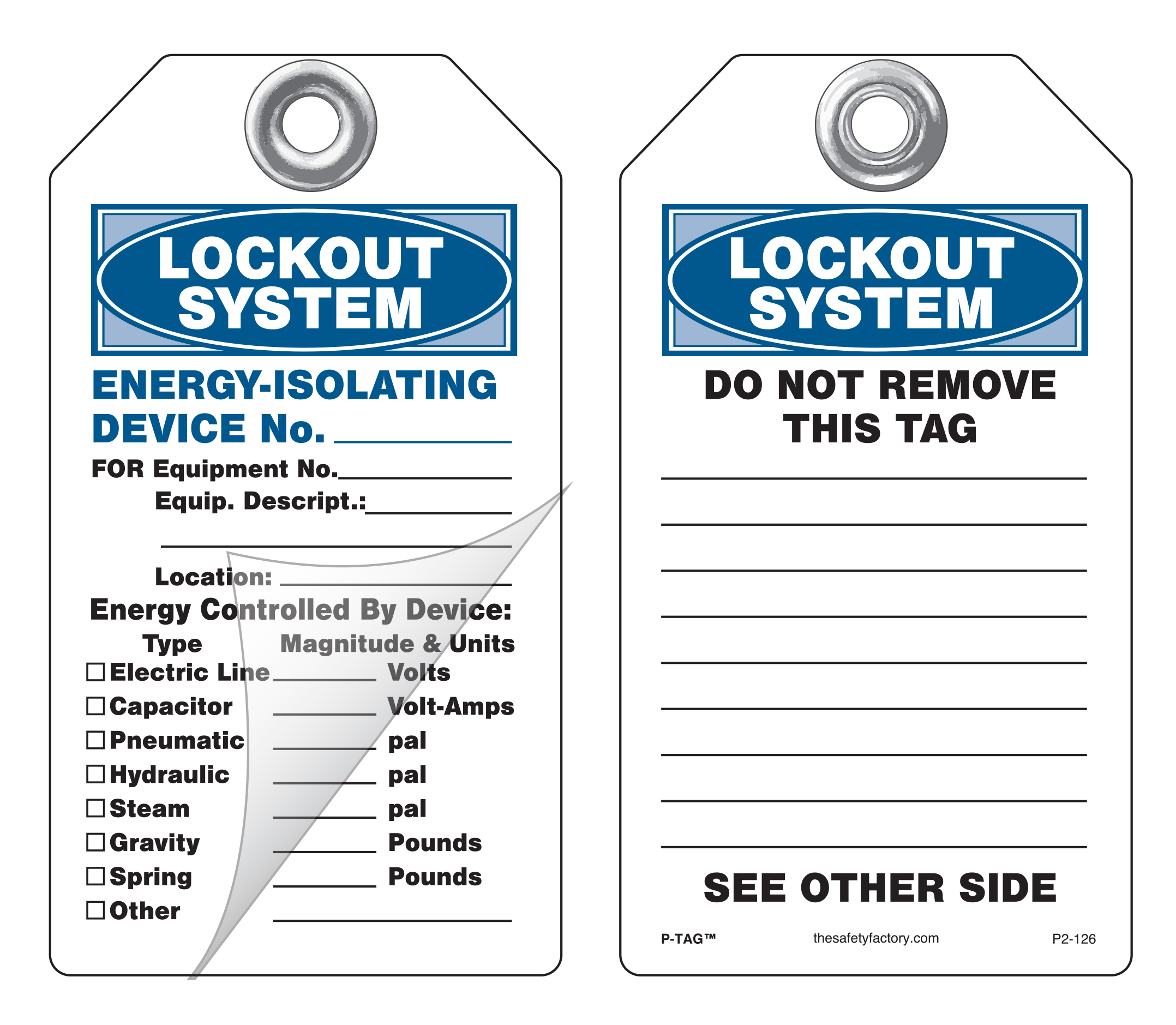 These self-laminating P/S lockout, safety and operational tags allow you to write specific instructions in pen, pencil or marker. Then simply press down a pressure-sensitive laminating film which protects the tag from moisture, dirt, grease and chemicals. No equipment is needed to laminate these tags. Each tag has a pull strength that exceeds the OSHA-required 50 lbs. Printing is on rigid plastic and a 2 mil polyester lamination on either one or two sides.