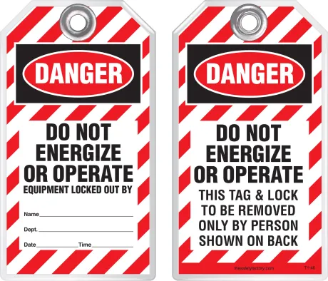 Safety tags come in standard size 3-1/8 x 5-5/8 and are also available in custom sizes and custom designs - add your company's logo, or customize your tags with special wording. Safety tags are also available in 2 alternative, economical materials shown below.