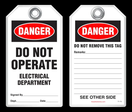 Safety tags come in standard size 3-1/8 x 5-5/8 and are also available in custom sizes and custom designs - add your company's logo, or customize your tags with special wording. Safety tags are also available in 2 alternative, economical materials shown below.