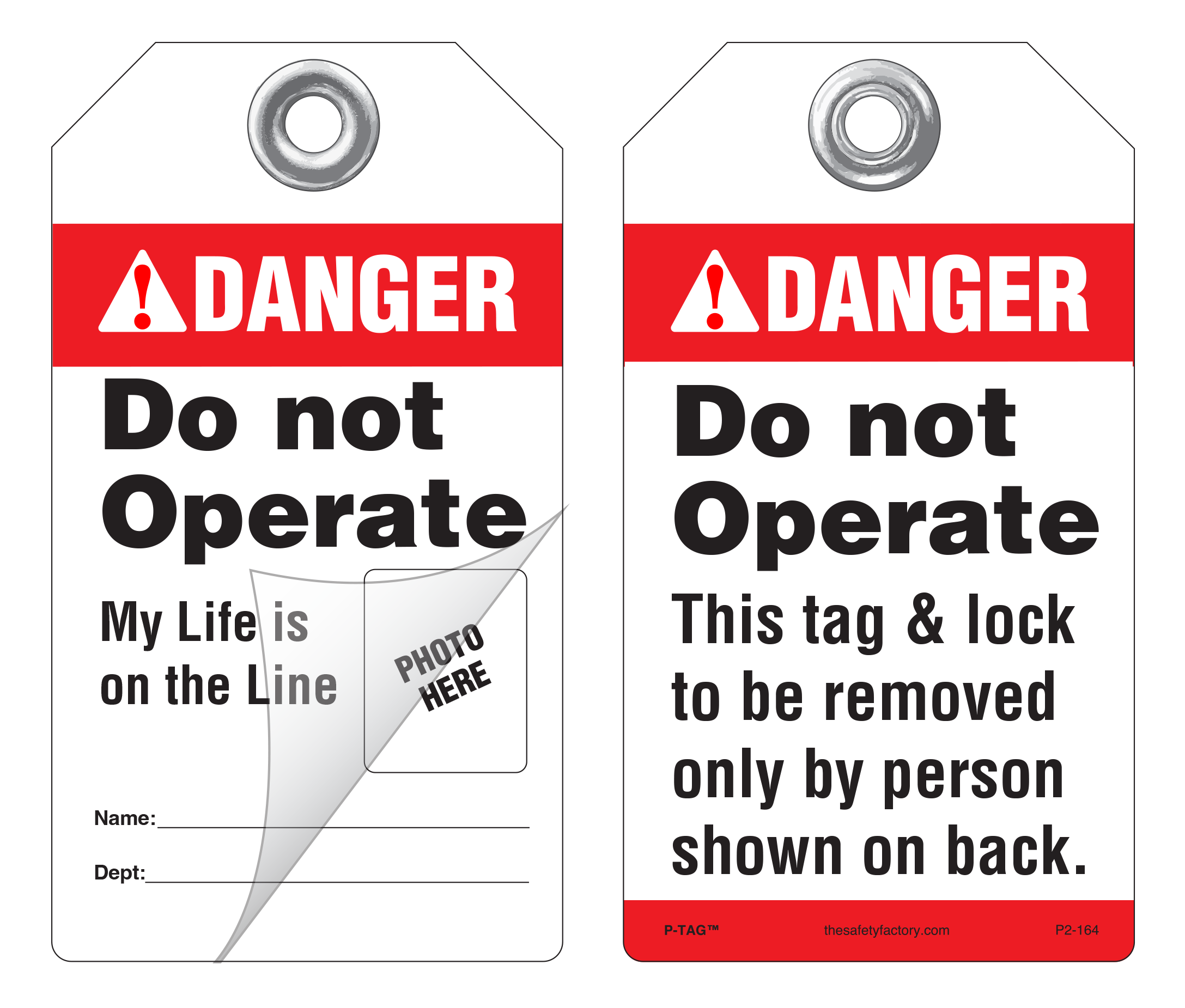 These Real-Life® self-laminating P/S lockout tags allow you to attach a photograph of the specific person responsible for the lockout. These self-laminated lockout, safety and operational tags also allow you to write specific instructions in pen, pencil or marker. Then simply press down a pressure-sensitive laminating film which protects the tag from moisture, dirt, grease and chemicals. No equipment is needed to laminate these tags. Each tag has a pull strength that exceeds the OSHA-required 50 lbs. Printing is on rigid plastic and a 2 mil polyester lamination on either one or two sides.