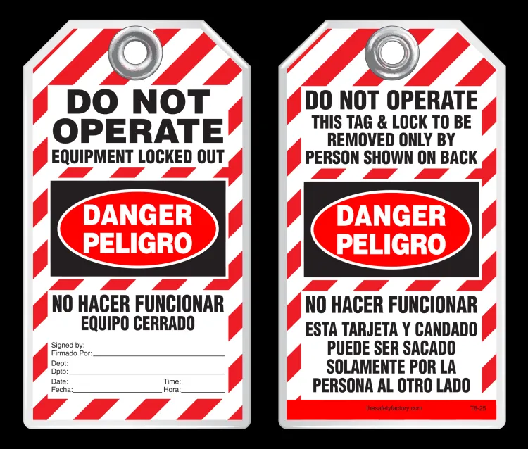 | Legend: | DANGER, PELIGRO, DO NOT OPERATE, EQUIPMENT LOCKED OUT BY, NO HACER FUNCIONAR (English/Spanish) |