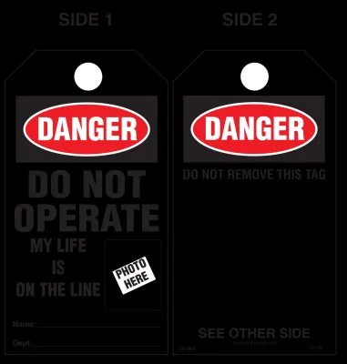 This lockout/tagout tag alerts employees not to operate tagged equipment, with the added motivational message, "My Life Is On the Line".
