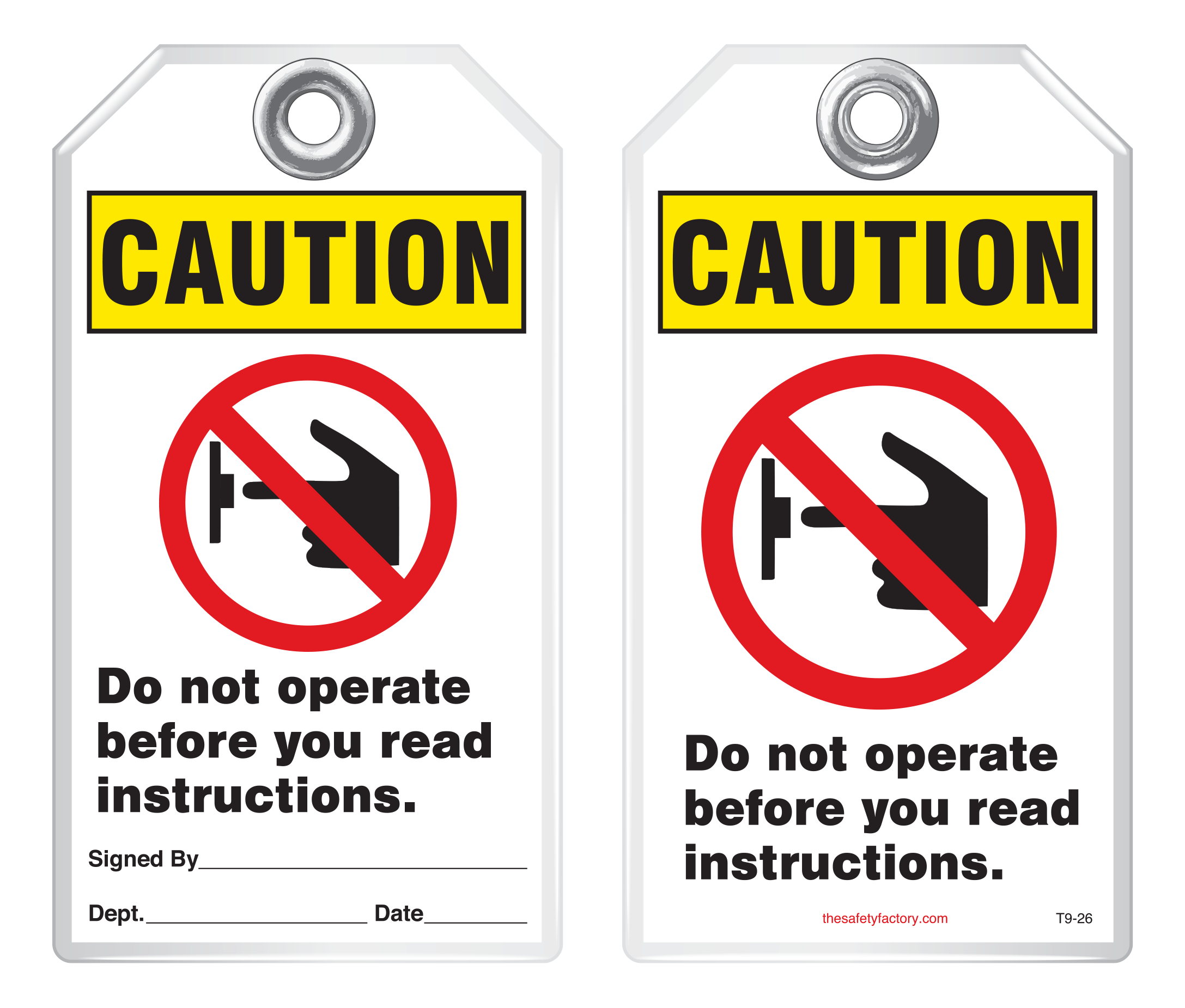 The Safety Factory's Classic Industrial safety tags are uniquely durable and strong and they are the most popular lockout safety tag for thousands of industrial companies around the world! They hold up against moisture, dirt, grease, chemicals and extreme temperatures. Each tag has a 3/8 hole reinforced with a metal grommet and has a pull strength that exceeds the 50 lb pull strength established by OSHA's Lockout/Tagout standard (OSHA 1910.147). Printing is UV protected and encapsulated inside rigid PVC. This rugged material has a durable, hard-matte finish which retains pen, pencil and marker notations and pencil may be erased for multiple use.