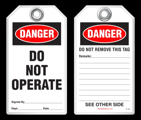 Safety tags come in standard size 3-1/8 x 5-5/8 and are also available in custom sizes and custom designs - add your company's logo, or customize your tags with special wording. Safety tags are also available in 2 alternative, economical materials shown below.