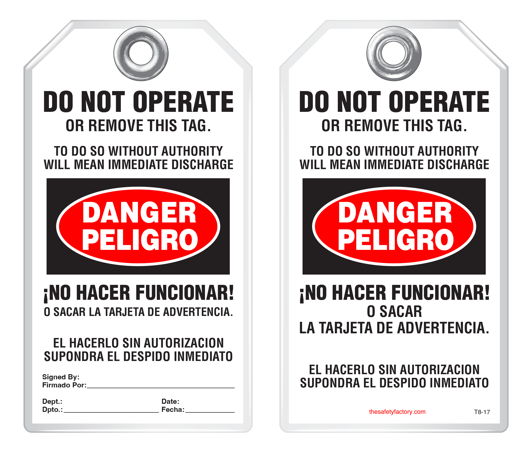 Safety tags come in standard size 3-1/8 x 5-5/8 and are also available in custom sizes and custom designs - add your company's logo, or customize your tags with special wording. Safety tags are also available in 2 alternative, economical materials shown below.