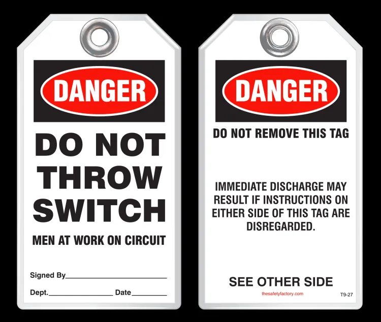 Safety tags come in standard size 3-1/8 x 5-5/8 and are also available in custom sizes and custom designs - add your company's logo, or customize your tags with special wording. Safety tags are also available in 2 alternative, economical materials shown below.