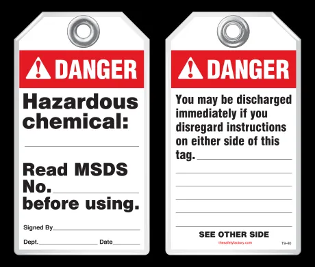 Safety tags come in standard size 3-1/8 x 5-5/8 and are also available in custom sizes and custom designs - add your company's logo, or customize your tags with special wording. Safety tags are also available in 2 alternative, economical materials shown below.