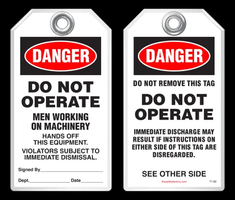 Safety tags come in standard size 3-1/8 x 5-5/8 and are also available in custom sizes and custom designs - add your company's logo, or customize your tags with special wording. Safety tags are also available in 2 alternative, economical materials shown below.
