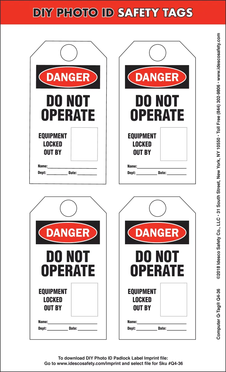 Use our DIY Photo ID Safety Tags to put a photo of the person responsible for the lockout directly onto the equipment being locked out. All you need is a camera (smart phone cameras are fine!) and an office printer (inkjet or laser). Make sure your lockouts are easy to identify!