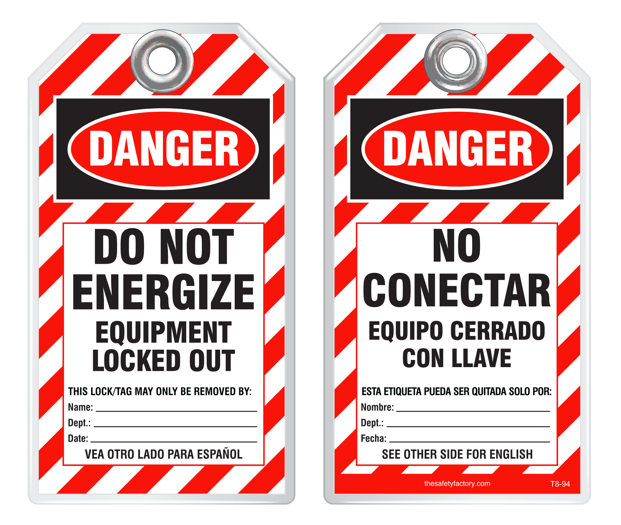 Bilingual Safety Tag - Danger, Do Not Energize, Equipment Locked Out, No Conectar, Equipo Cerrado Con Llave T8-94