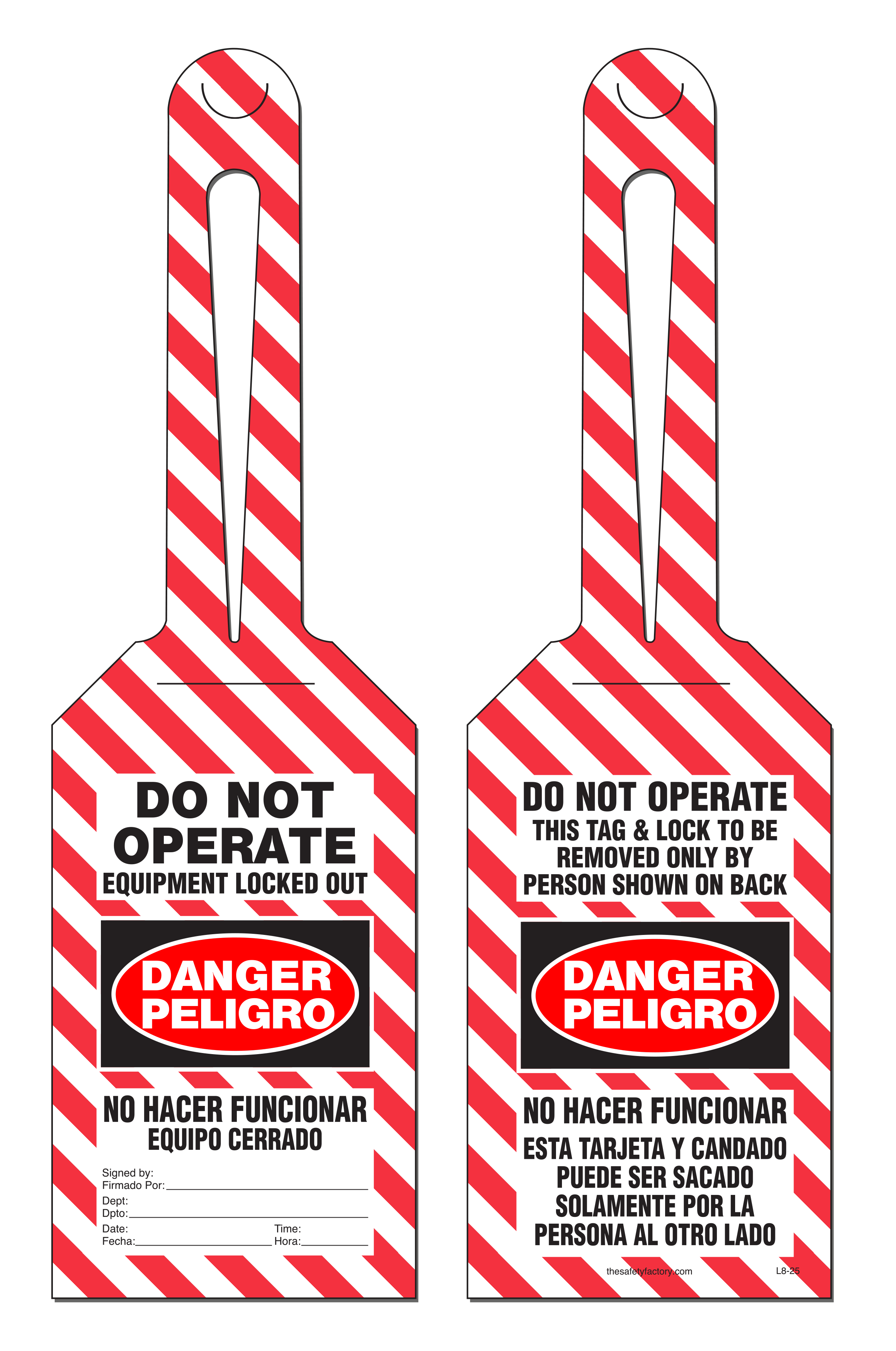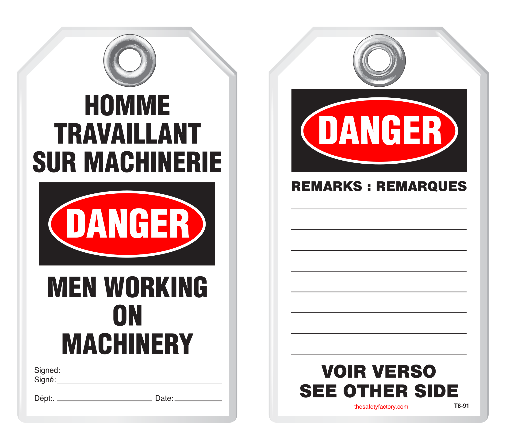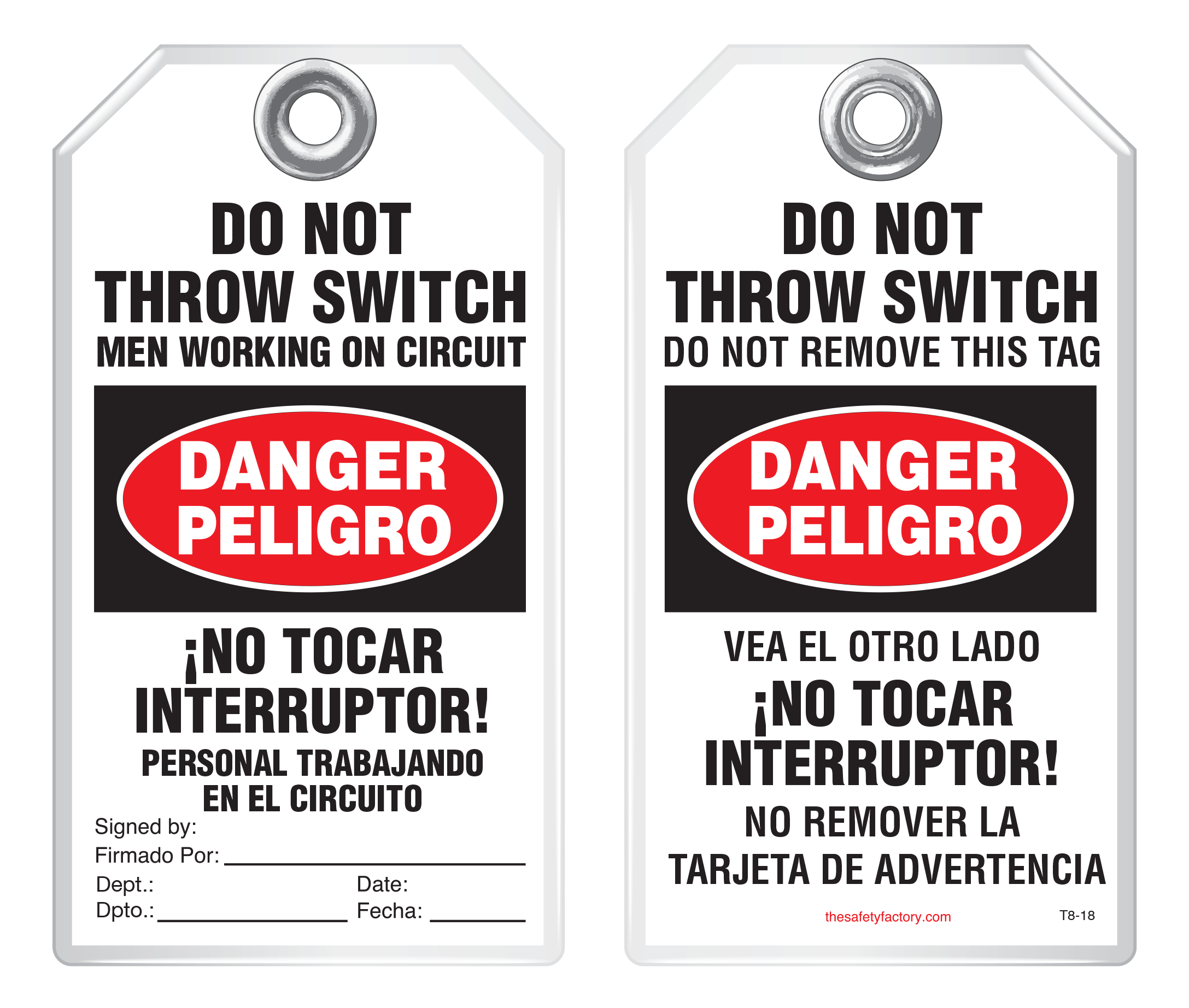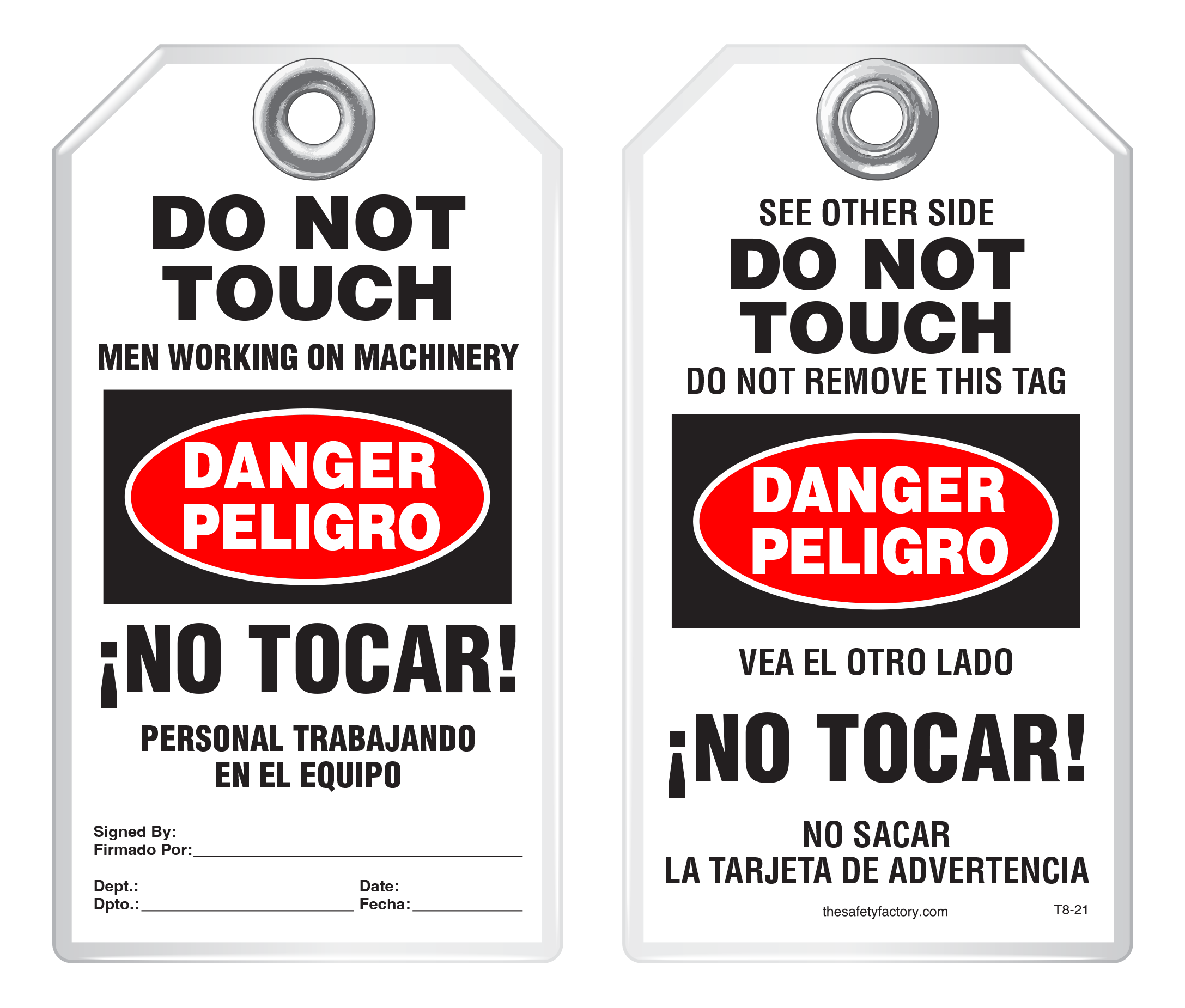 Idesco's Foreign Language and Bilingual Safety Tags notify Spanish- and French-speaking employees when equipment is locked out, in need of repair, or when special precaution needs to be taken. These tags are durable and strong and withstand moisture, dirt, grease, chemicals and extreme temperatures. They are reinforced with a 3/8" metal grommet. Each tag has a pull strength that exceeds the OSHA-required 50 lbs. Printing is encapsulated inside rigid PVC. This rugged material has a durable, hard-matte finish which retains pen, pencil and marker notations and pencil may be erased for multiple use. The tags are clear and effective at reducing accidents and preventing worksite mishaps.