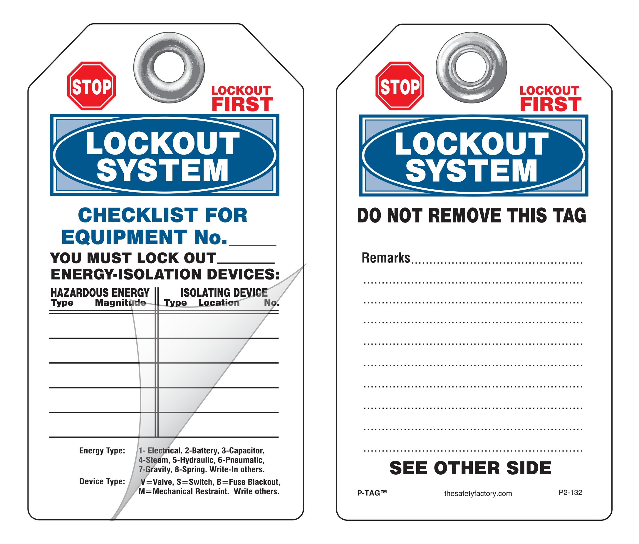 These self-laminating P/S lockout, safety and operational tags allow you to write specific instructions in pen, pencil or marker. Then simply press down a pressure-sensitive laminating film which protects the tag from moisture, dirt, grease and chemicals. No equipment is needed to laminate these tags. Each tag has a pull strength that exceeds the OSHA-required 50 lbs. Printing is on rigid plastic and a 2 mil polyester lamination on either one or two sides.