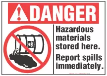 Danger Sign, Hazardous Materials Stored Here. Report Spills Immediately (With Symbol)