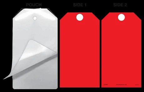 These Self-Laminating Tag Kits allow you to customize a tag by writing specific instructions in pen, pencil or marker. The tag is then laminated with a heavy-duty Laminating Pouch included in the Kit, by passing the tag and pouch through an Idesco desktop laminator (or other laminating machine). The tag is sealed in 20 mils of rigid plastic, fully protected from moisture, dirt, grease and chemicals. This durable tag exceeds the OSHA-required 50 lbs for lockout situations. Laminating Pouches are available with a matte finish on both sides, a gloss finish on both sides, or with one side matte, one side gloss.