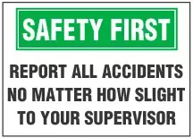 Safety First Sign, Report All Accidents No Matter How Slight To Your Supervisor