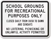This sign announces that Children Walk School Grounds For Recreational Purposes Only. The School Closes Daily From Dusk to Dawn and Sundays. No Loitering, Picnicking or Unlawful Activity Permitted.
