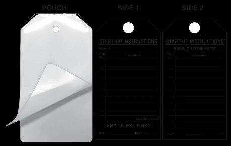 These Self-Laminating Tag Kits allow you to customize a tag by writing specific instructions in pen, pencil or marker. The tag is then laminated with a heavy-duty Laminating Pouch included in the Kit, by passing the tag and pouch through an Idesco desktop laminator (or other laminating machine). The tag is sealed in 20 mils of rigid plastic, fully protected from moisture, dirt, grease and chemicals. This durable tag exceeds the OSHA-required 50 lbs for lockout situations. Laminating Pouches are available with a matte finish on both sides, a gloss finish on both sides, or with one side matte, one side gloss.
